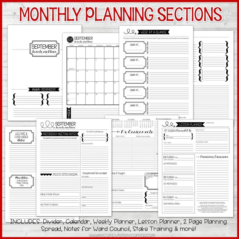 HOW TO PRINT & ASSEMBLE: Print your planner on regular white paper and choose "double sided printing". All inside pages are black and white only (which makes printing much less expensive). For the covers, print one front cover for each member of the presidency (pages 1-4)... then print page 5 (the back cover) for each planner you make. The covers are designed for "borderless" printing, so if you are printing at home - select "photo printing" on your print properties, check the "fit" box and choose 8.5x11 borderless in your print properties. Most home inkjets and photo printers will perform this function (mine is 3 years old and does a fantastic job). For most vivid color results, use a heavy stock, preferably of glossy photo paper quality. I laminate my covers before binding to increase durability. Printing your covers can also be done at a copy shop. For the least expensive option, simply print, punch and use in a 3 ring binder!