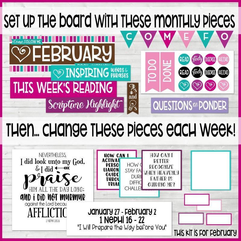 If you are looking for a way to organize and manage Come, Follow Me for Individuals and Families (Book of Mormon/2020) - look no further! This bulletin board kit is a fun, informative way to keep your family on track with the reading schedule!