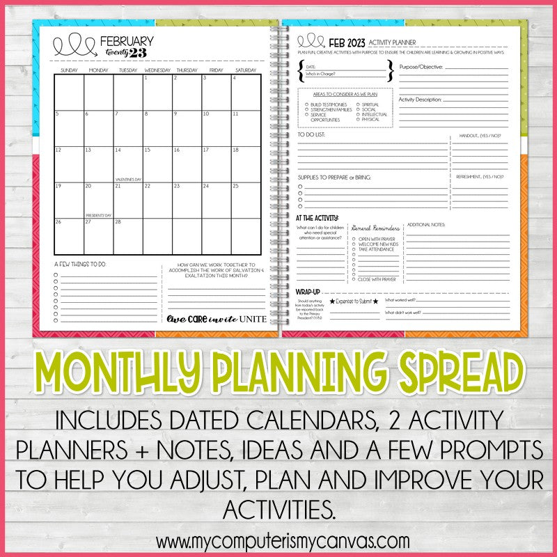 Putting together fun and purposeful Primary Activities takes lots of organization and planning! This planner is an effective, easy to use tool to help you stay organized, work as a team with your fellow leaders and to help frame your activities in meaningful and inclusive ways. With guided planning prompts, you'll find it easier than ever to fill the calendar with great activities! Some pages in this printable are editable (calendars, birthday list, roster, etc)