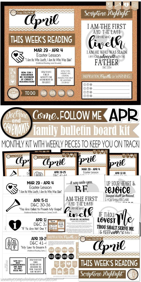 If you are looking for a fun, visual way to display and remember Come, Follow Me each week - look no further! This bulletin board kit printable is a quick, easy and informative way to keep your family on track with the reading schedule... AND with a special weekly icon, a verse highlight and 3 thoughtful questions - it can also help jump start your family discussion!