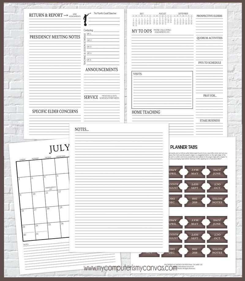 HOW TO PRINT & ASSEMBLE: Print your planner on regular white paper and choose "double sided printing". All inside pages are black and white only (which makes printing much less expensive). For the covers, print one front cover for each member of the presidency (pages 1-4)... then print page 5 (the back cover) for each planner you make. The covers are designed for "borderless" printing, so if you are printing at home - select "photo printing" on your print properties, check the "fit" box and choose 8.5x11 borderless in your print properties. Most home inkjets and photo printers will perform this function (mine is 3 years old and does a fantastic job). For most vivid color results, use a heavy stock, preferably of glossy photo paper quality. I laminate my covers before binding to increase durability. Printing your covers can also be done at a copy shop.