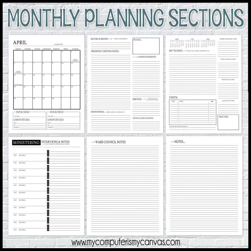 HOW TO PRINT & ASSEMBLE: Print your planner on regular white paper and choose "double sided printing". All inside pages are black and white only (which makes printing much less expensive). For the covers, print one front cover for each member of the presidency (pages 1-4)... then print page 5 (the back cover) for each planner you make. The covers are designed for "borderless" printing, so if you are printing at home - select "photo printing" on your print properties, check the "fit" box and choose 8.5x11 borderless in your print properties. Most home inkjets and photo printers will perform this function (mine is 3 years old and does a fantastic job). For most vivid color results, use a heavy stock, preferably of glossy photo paper quality. I laminate my covers before binding to increase durability. Printing your covers can also be done at a copy shop.