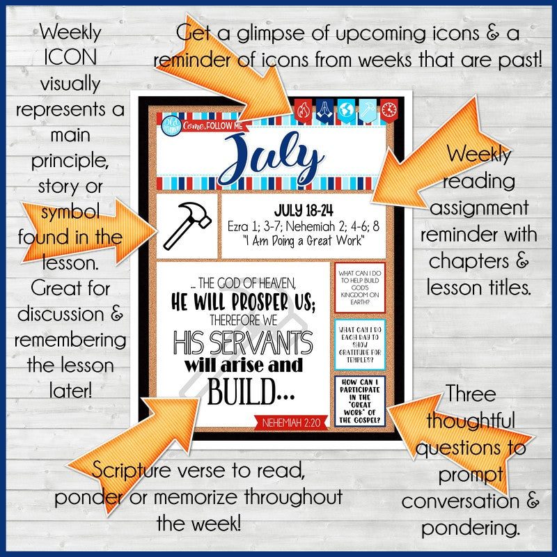 If you are looking for a fun, visual way to display and remember Come, Follow Me each week - look no further! My WEEKLY "faux" bulletin board pages are a quick, easy and informative way to keep your family on track with the reading schedule... and with a special weekly icon, a verse highlight and 3 thoughtful questions - it can also help jump start your family discussion! I call it "faux" because it's designed to LOOK like a bulletin board, but all you have to do is print and display!