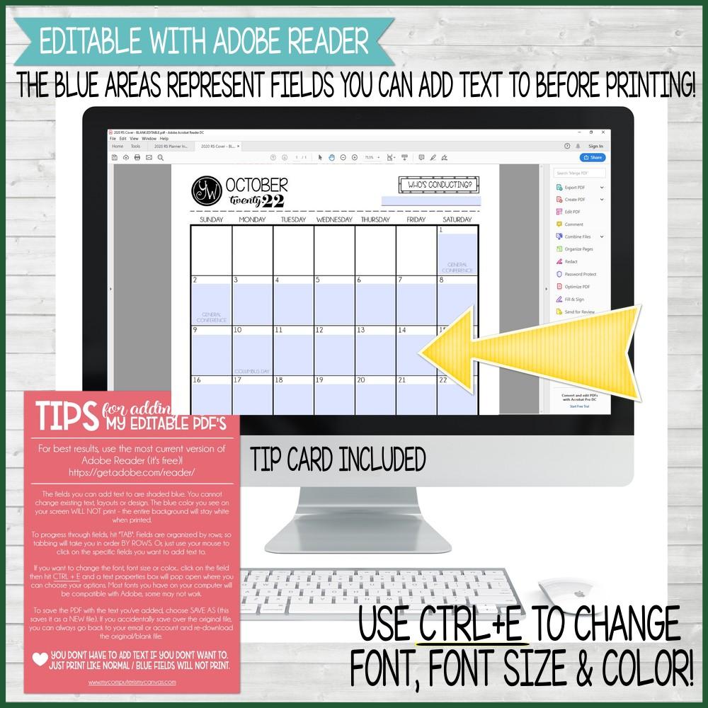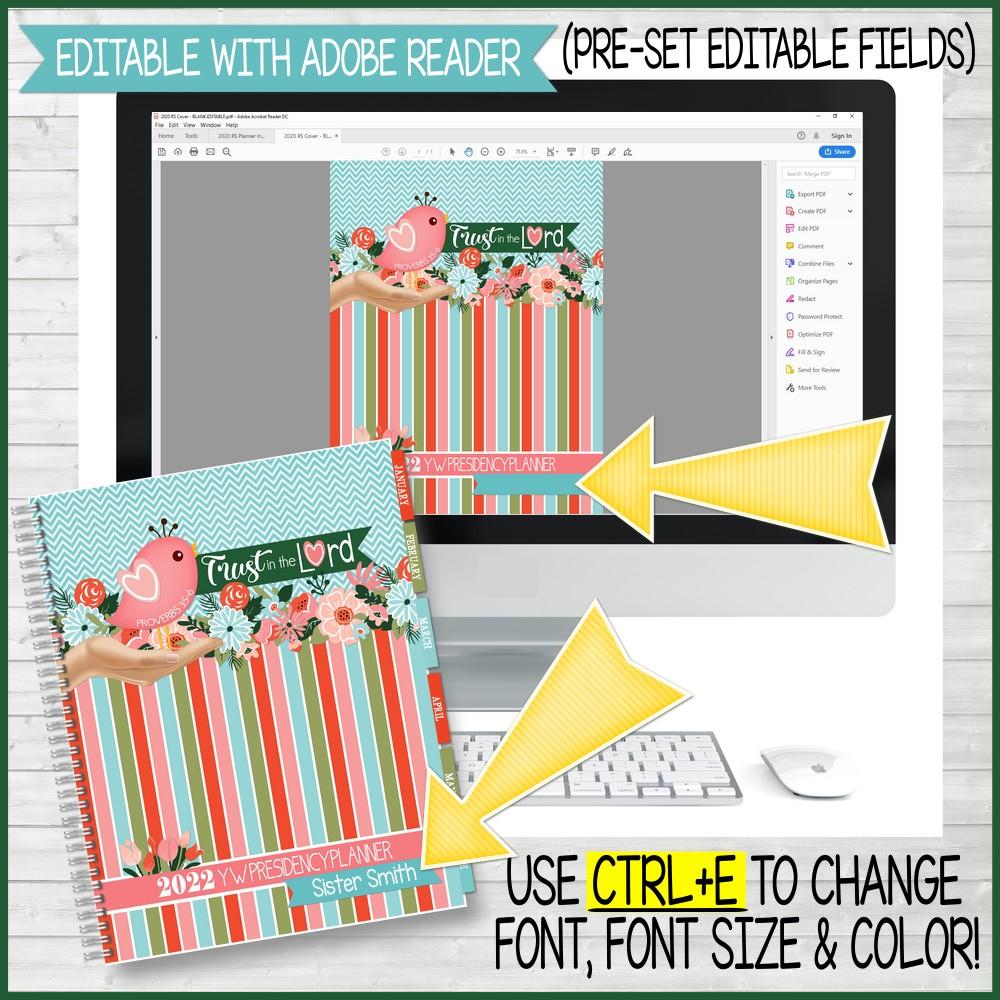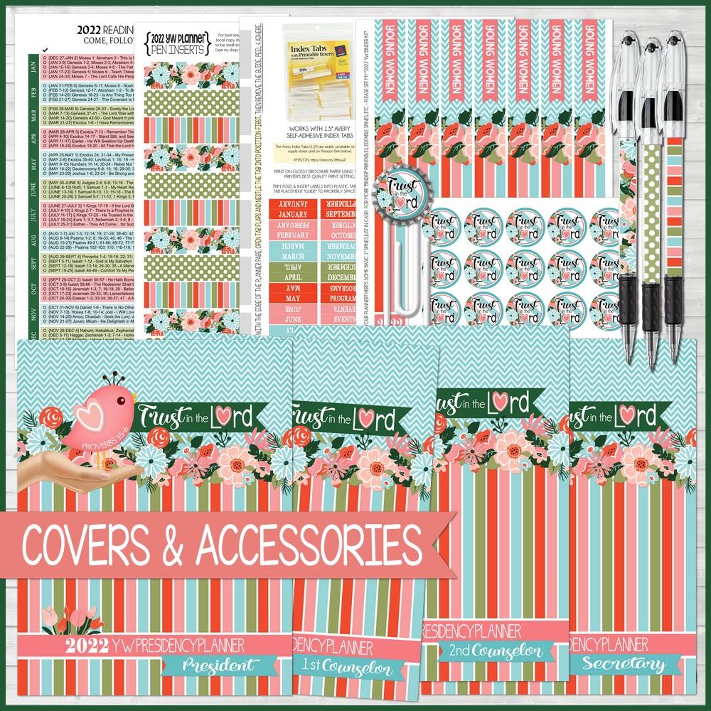 INCLUDED IN THIS LISTING: This listing includes OVER 100 planning pages and accessories - ALL EDITABLE IN ADOBE READER! Included are covers for each member of the Presidency (+ blank for adding any calling you want); a matching 2022 CFM Reading Schedule, a sheet of printable sticker/divider tabs, coordinating pen inserts for RSVP Pentel Pens and a matching bottle cap image!