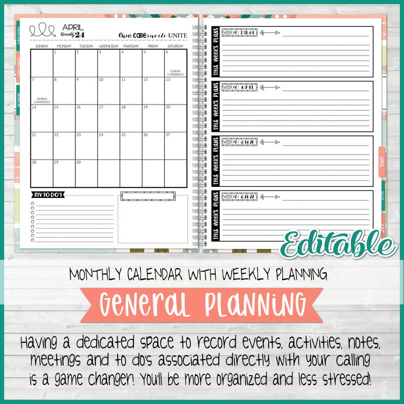 INTRODUCING my newest planner… the “ANY CALLING” Planner! From Nursery to Ward Missionary, from Activity Committee Member to Family History Consultant, even Ward Chorister or a Specialist… and everywhere in-between, there is now a fun planner for YOU! The cover is editable – so add your name OR your calling, the inside has monthly sections, calendars and simplified planning spaces so you can manage and organize your calling, no matter what it is! Maybe you’re in a Presidency and they don’t use a dedicated planner (but you secretly wanted one) – or maybe you’re in a busy Stake calling and just need something to keep you on track! Or, maybe you just have a calling that needs a little bit of management and planning and you are tired of post-it notes and composition notebooks!