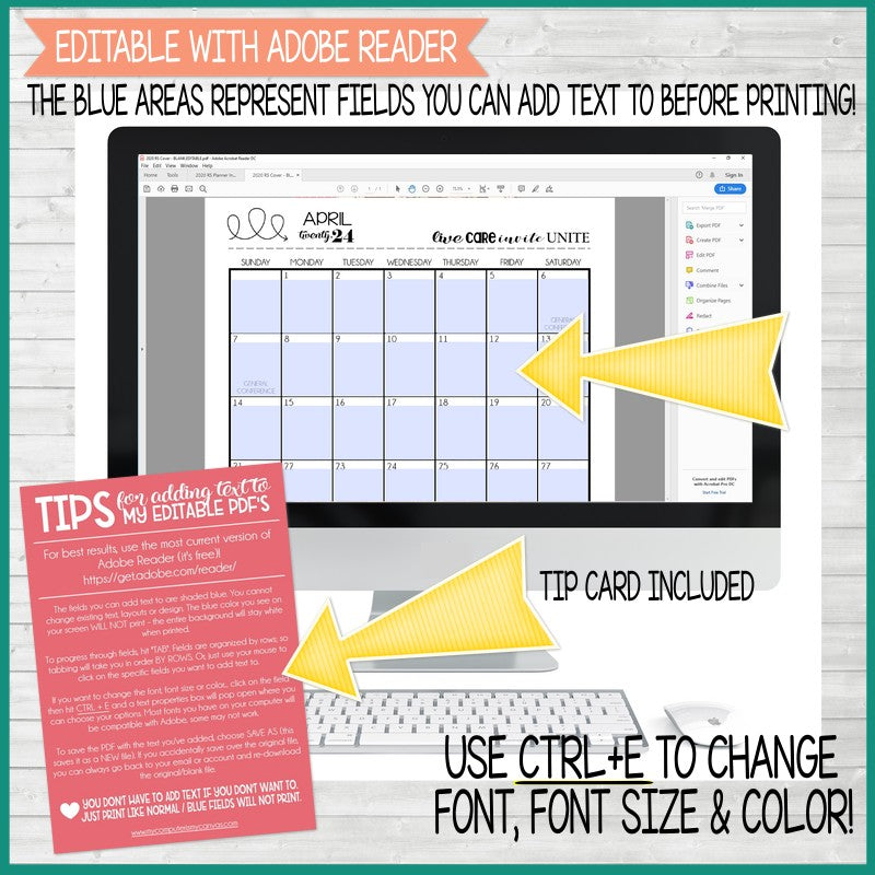EDITABLE (using Adobe Reader): Pre-set fields are already programmed for you, simply open the PDF with the latest version of Adobe Reader (which is free) and you can add birthdays, events, etc before printing. A tip sheet is included to help you get started with the basics! Existing text, design and layout cannot be changed. Download Adobe HERE.