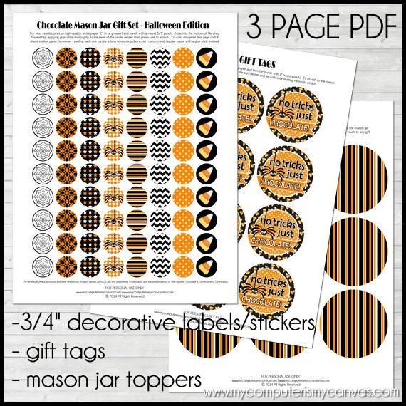 INCLUDED IN THIS LISTING: This listing includes a high-quality PDF that you can print at home or at a copy shop. Page 1 includes a variety of 3/4" round, Halloween-themed designs. Page 2 is a sheet of 2" circle gift tags and Page 3 is a sheet of Mason Jar lid toppers designed to go on the lid (but under the ring).