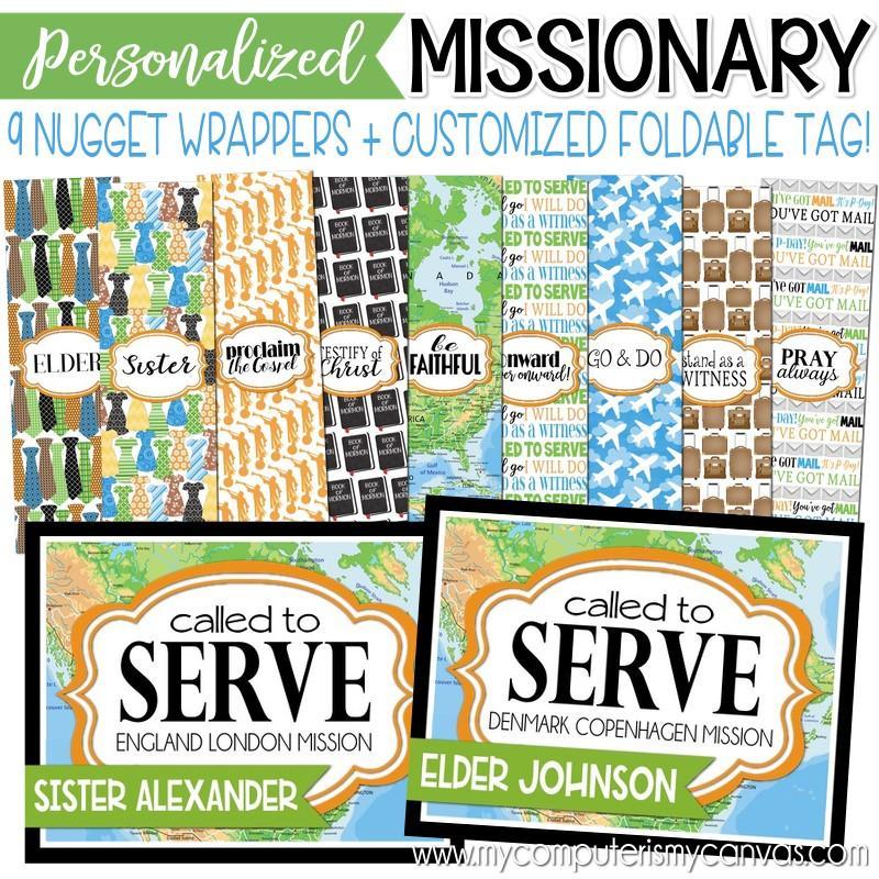 ★ PLEASE NOTE: This listing contains the SAME nugget wrappers as my "LDS Missionary CALLED to SERVE, Chocolate Nugget Wrappers" - the ONLY difference is this listing includes a personalized tag/topper (as shown in the pictures). This listing is for the "printable" wrappers and tag only - the customer is responsible for downloading, printing and assembling the nuggets and trays.