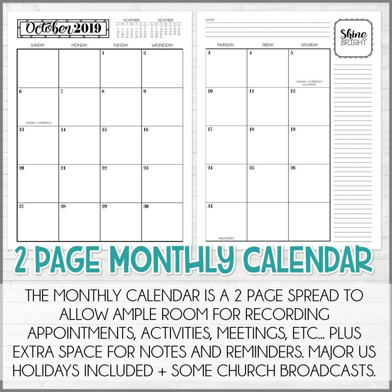 2 PAGE MONTHLY CALENDAR: The monthly calendar is a 2-page spread to allow ample room for recording appointments, special dates, activities, meetings, events, etc + there is extra space for notes and reminders. Major US holidays included + major church broadcasts.