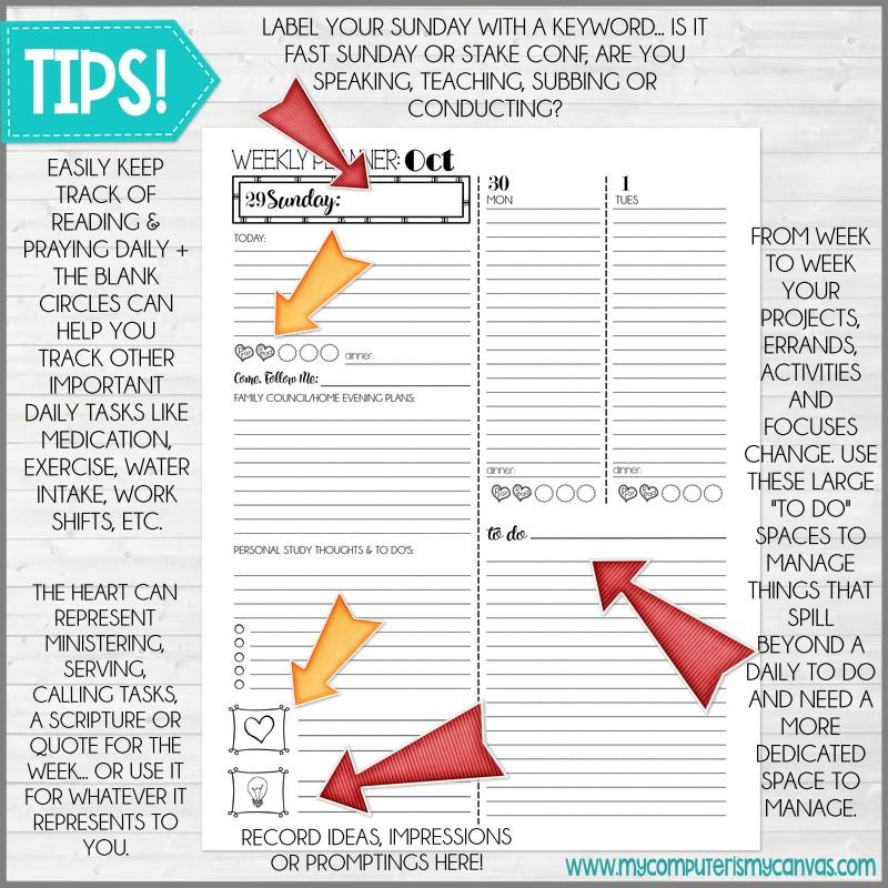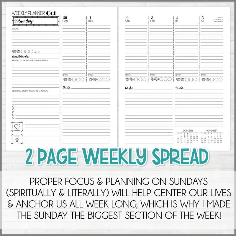 This NEW unique planner layout, designed specifically with the Latter-day Saint woman in mind, allows her to manage all aspects of her busy life. It gives her daily, weekly and monthly planning space to juggle it all; including her church callings, ministering assignments and personal spiritual growth. This intuitive layout visually centers her week on the Sabbath (with space for noting Come Follow Me goals), yet has adequate space to plan the everyday happenings of her busy life. I hope you love this as much as I do!