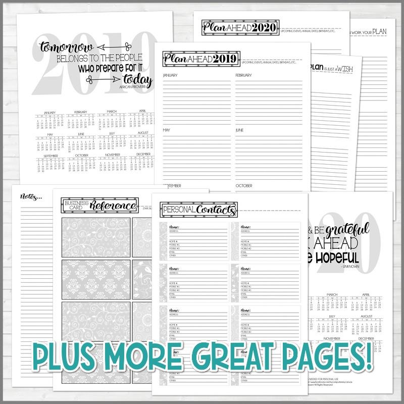 OTHER PAGES: Annual at-a-glance Calendars for 2019 & 2020, planning ahead for 2019 & 2020, contacts and notes.