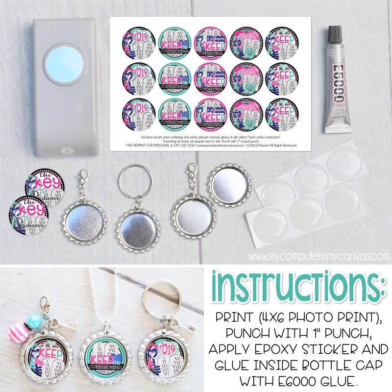 HOW TO MAKE YOUR BOTTLE CAPS... Print your 4x6 at a local photo lab just like you would any 4x6 photo. Punch image with 1" round punch and apply epoxy sticker. Next, use E6000 glue to adhere to bottle cap. Supply recommendations listed below.