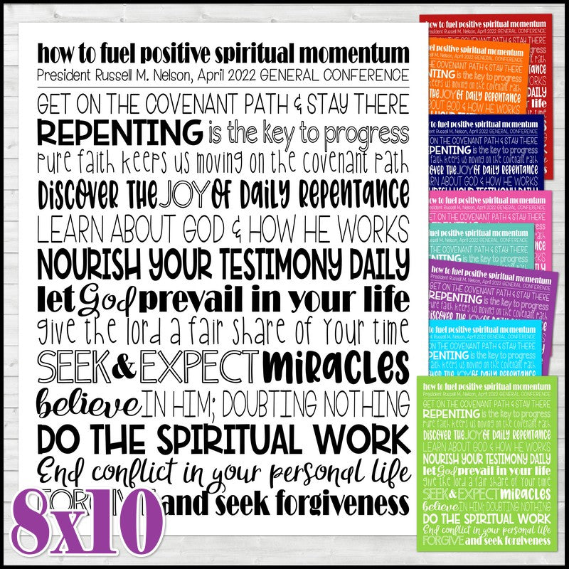 I've been designing printable 5x7 General Conference Quotes since 2015 and decided to collect all the quotes I've done from President Nelson's talks and combine them into one set! There are 37 total + a FULL 8x10 Subway Art that highlights ALL the amazing gems he shared in his April 2022 General Conference Talk, "Spiritual Momentum". It's one of my most favorite talks of all time and I'm so happy I can share his beautiful counsel through my silly little love of fonts and color! ♥