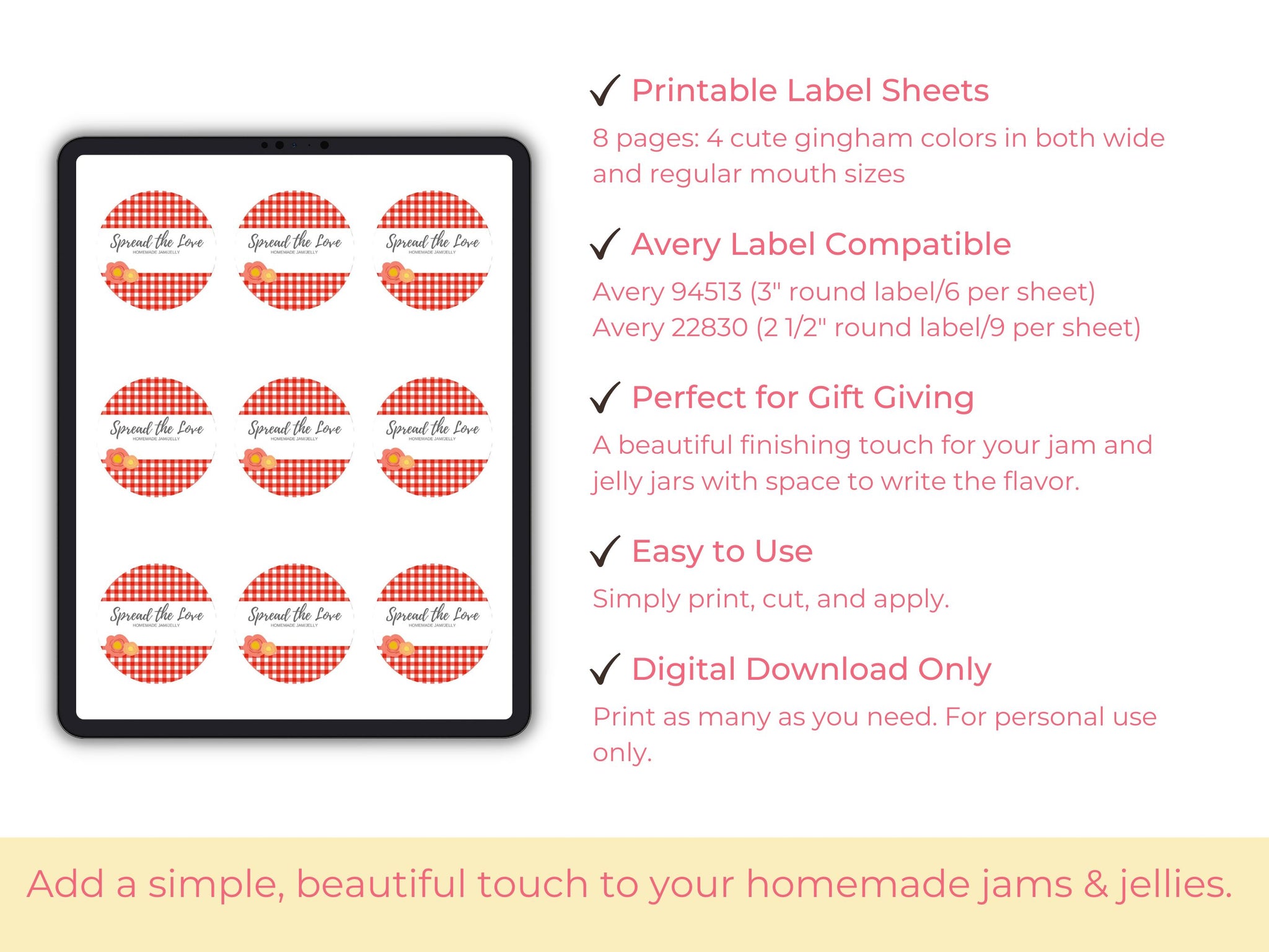 Add a simple, beautiful finishing touch to your homemade jams, jellies, and preserves. These coordinating“Spread the Love” mason jar labels are designed to fit both wide mouth and regular mason jar lids, making iteasy to create a cohesive and charming pantry or gift set during harvest season. Perfect for homesteaders,gardeners, seasonal bakers, and anyone who loves sharing handmade food.