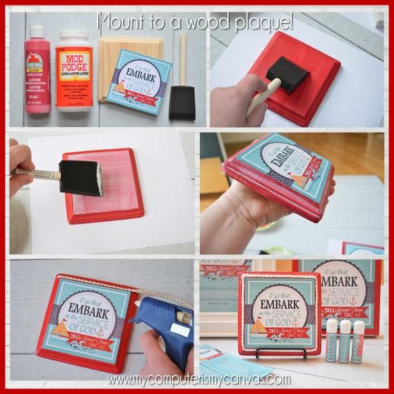 ASSEMBLY TIPS: {Square Tile Image} I printed the 4x4 page on glossy photo paper at home on my inkjet. I found a 4x4 wood plaque at Michaels and painted it red. I then did a THIN layer of ModPodge on the face of the plaque and applied the image. I rubbed over it well to make sure it was adhered and smooth, then I let it dry for 10-20 minutes before adding a thin coat to the top. To give it a consistent sheen, when I applied the ModPodge on the top - I did it on the edges too. Dry time after that was about 20 minutes. To embellish, I hot glued a rope-style ribbon to the edges and stood it on an easel. You can also follow the same basic instructions and mount one of the images to a white canvas - or use the 4x4 on a white shower tile! See my Tutorial: http://bit.ly/1Ou0SXP