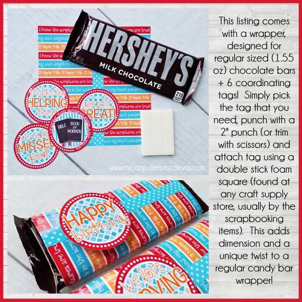 INCLUDED IN THIS LISTING: This listing includes a 7 page, high resolution PDF printable file. The first page contains the wrapper (designed for regular sized Hersh... brand chocolate bars; 1.55 oz). On pages 2-7 you'll find sheets of 2" round tags as shown.