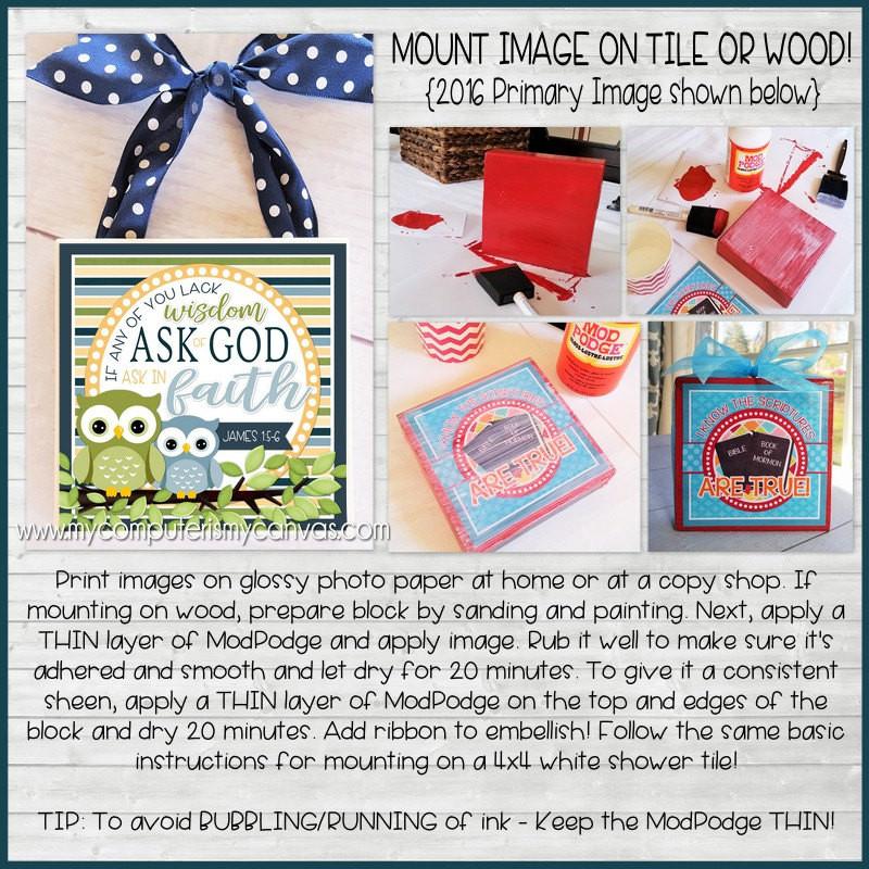 ASSEMBLY TIPS: {Square Tile Image} I printed the 4x4 page on glossy photo paper at home on my inkjet. I found a 4x4 wood plaque at Michaels and painted it red. I then did a THIN layer of ModPodge on the face of the plaque and applied the image. I rubbed over it well to make sure it was adhered and smooth, then I let it dry for 10-20 minutes before adding a thin coat to the top. To give it a consistent sheen, when I applied the ModPodge on the top - I did it on the edges too. Dry time after that was about 20 minutes. To embellish, I hot glued a rope-style ribbon to the edges and stood it on an easel. You can also follow the same basic instructions and mount one of the images to a white canvas - or use the 4x4 on a white shower tile! See my Tutorial: http://bit.ly/1Ou0SXP