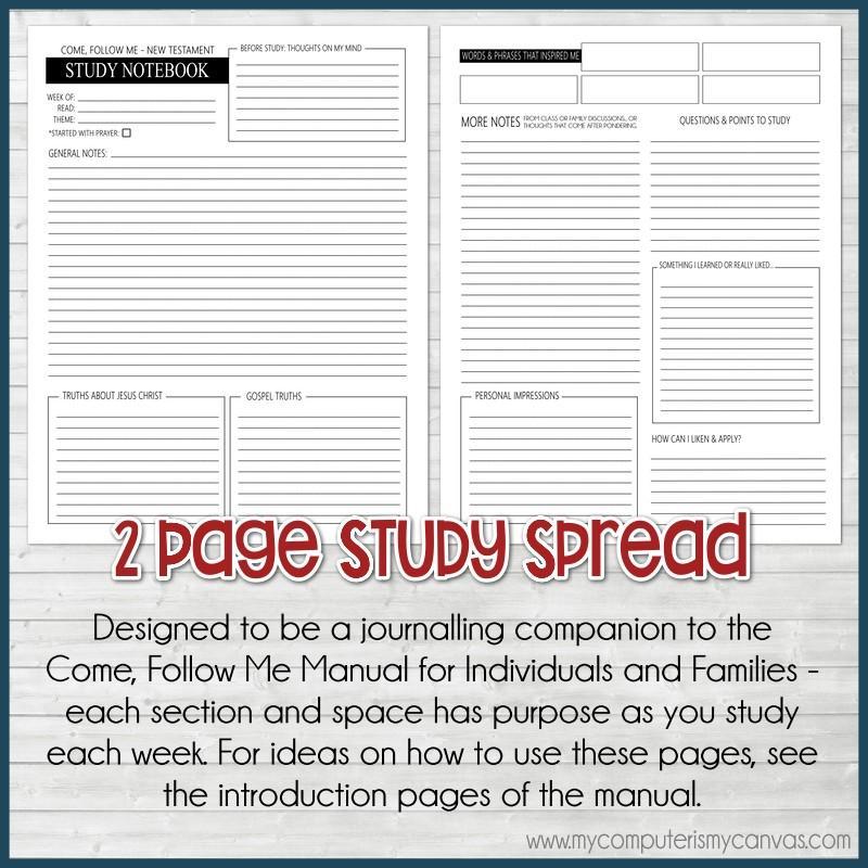 If you are looking for a way to organize your study for the *NEW* Come, Follow Me for Individuals and Families (New Testament) - look no further! This journal has a two page study/journal spread for each week with dedicated space for each focus area that is described in the introduction of the manual. Keys to studying the gospel with each reading assignment are recording impressions, looking for Gospel truths, looking for truths about Jesus Christ, watching for words and phrases that stand out AND pondering ways to liken and apply. This journal will give you a place to record thoughts on each topic + has plenty of general note taking space (as well as a spot to add notes from class and/or family discussions)!