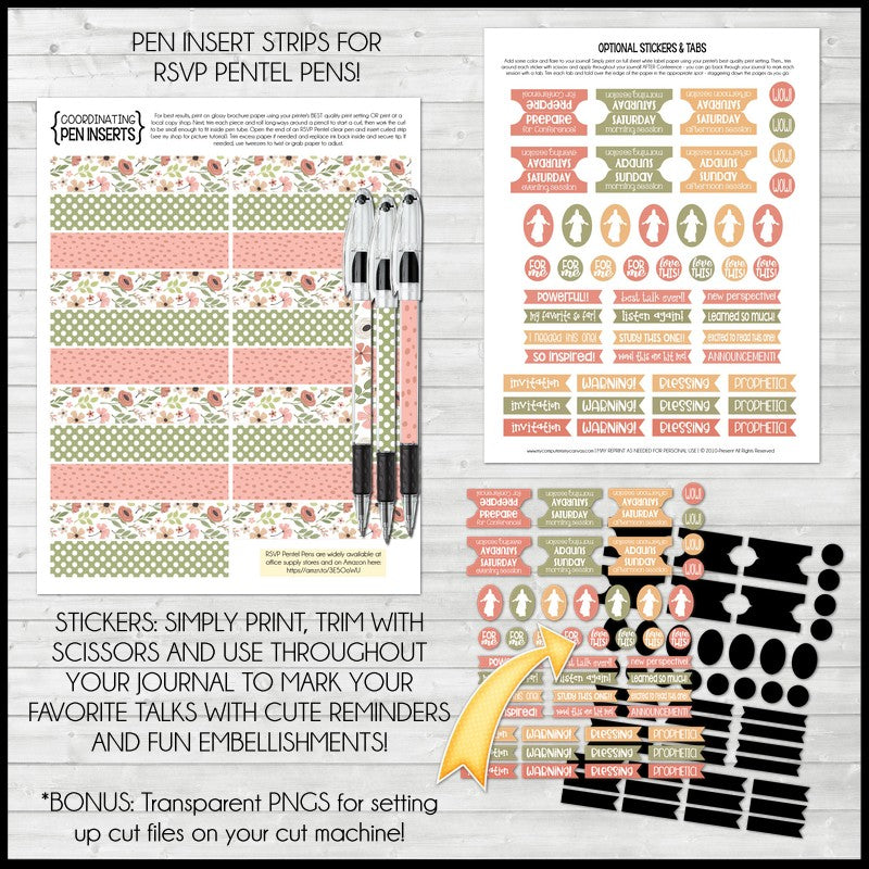 HOW TO USE THE STICKERS: For best results print on either full sheet label paper using your printer's "best" quality print setting for the most vibrant print. Then, trim with scissors and apply to your journal to bring attention to talks that impacted you the most! Wait until AFTER conference to apply your tabs so you know where each of the sessions begin/end. If you have a cutting machine, a JPEG & PNG is also included.